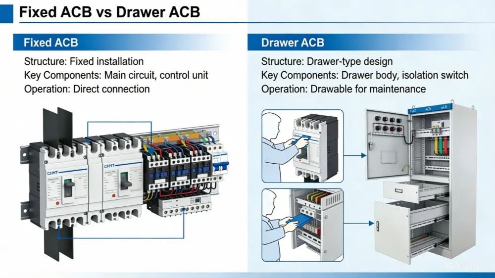 A tetep Air Circuit Breaker wis permanen dipasang nang kabinet.