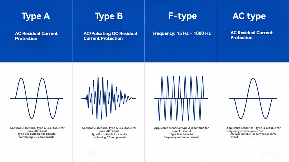 | Tipe Arus Sisa | Tipe AC | Arus residual AC sinusoidal; kanggo cahya umum, soket & beban resistif. |